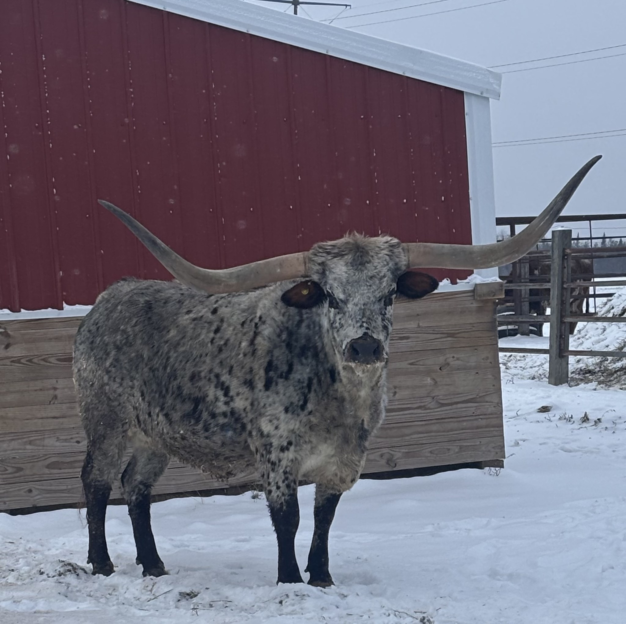 Beautiful dark grey/blue cow that is an absolute traffic stopper in the pasture. She had a beautiful blue roan bull for her first calf.