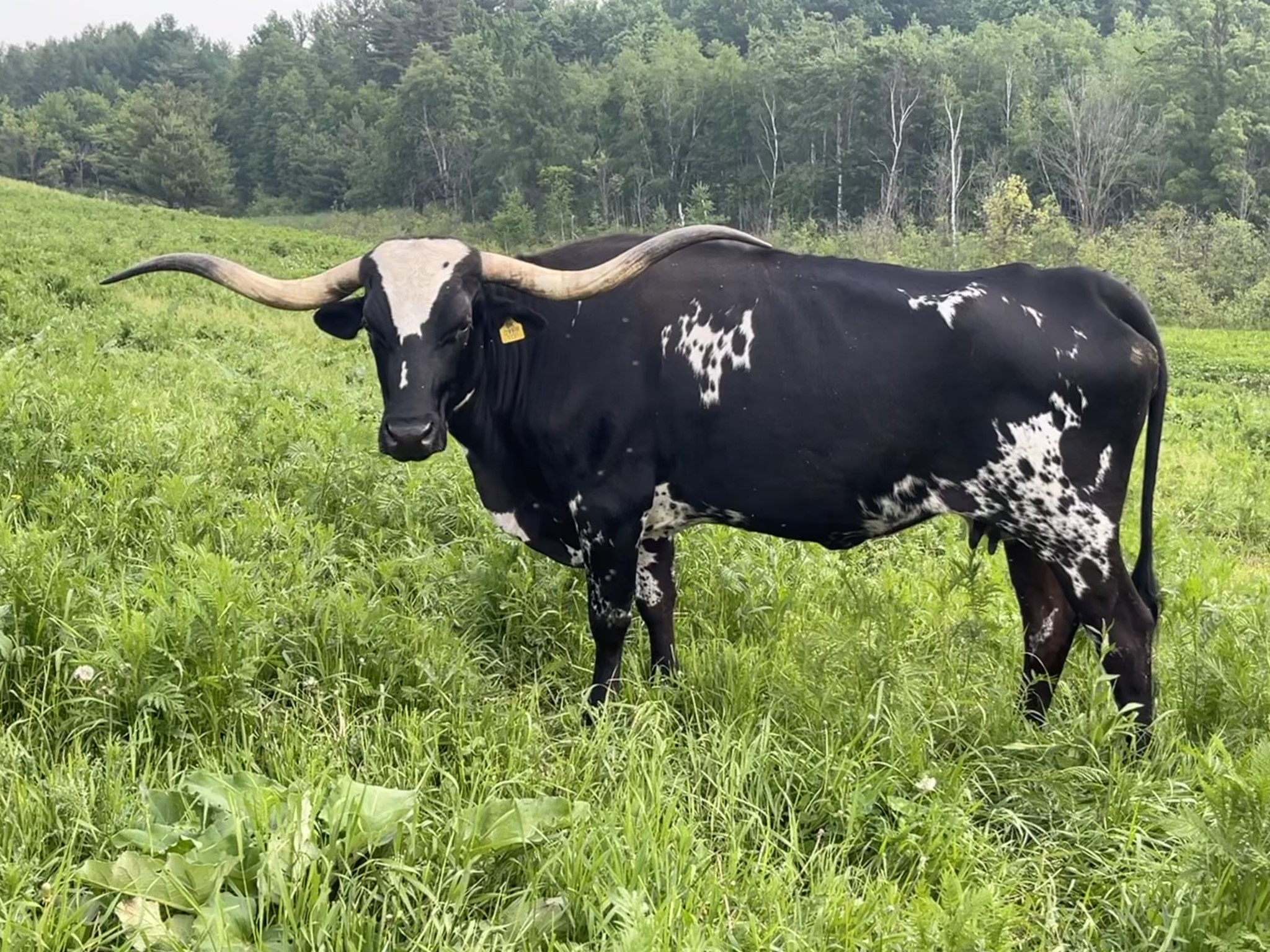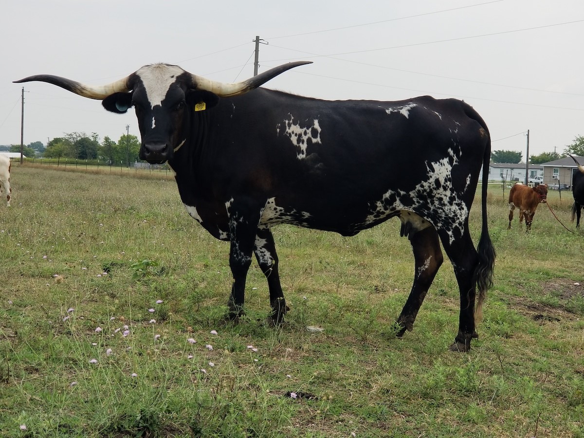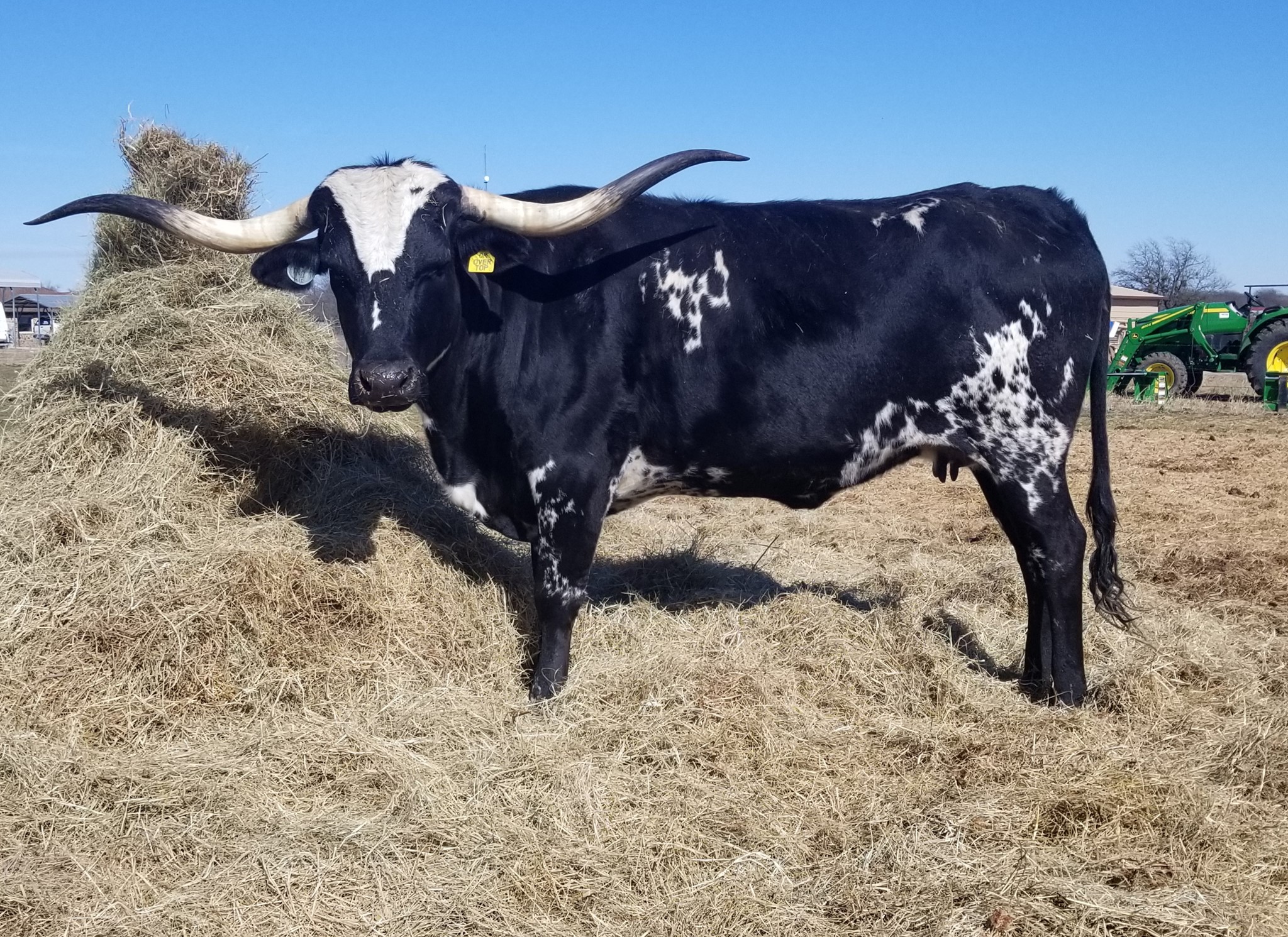 What a fun cow this one is! Over the Top has just started growing out of her black tips, so she should quickly start putting on more horn. Just look at that twist! She boasts a solid pedigree containing Overhead, Hunt's Command Respect, Superbowl, Overkill, Field of Pearls, Top Most; she's just loaded! She has proven that she can produce and raise a nice, big calf and we're certainly glad we have her.